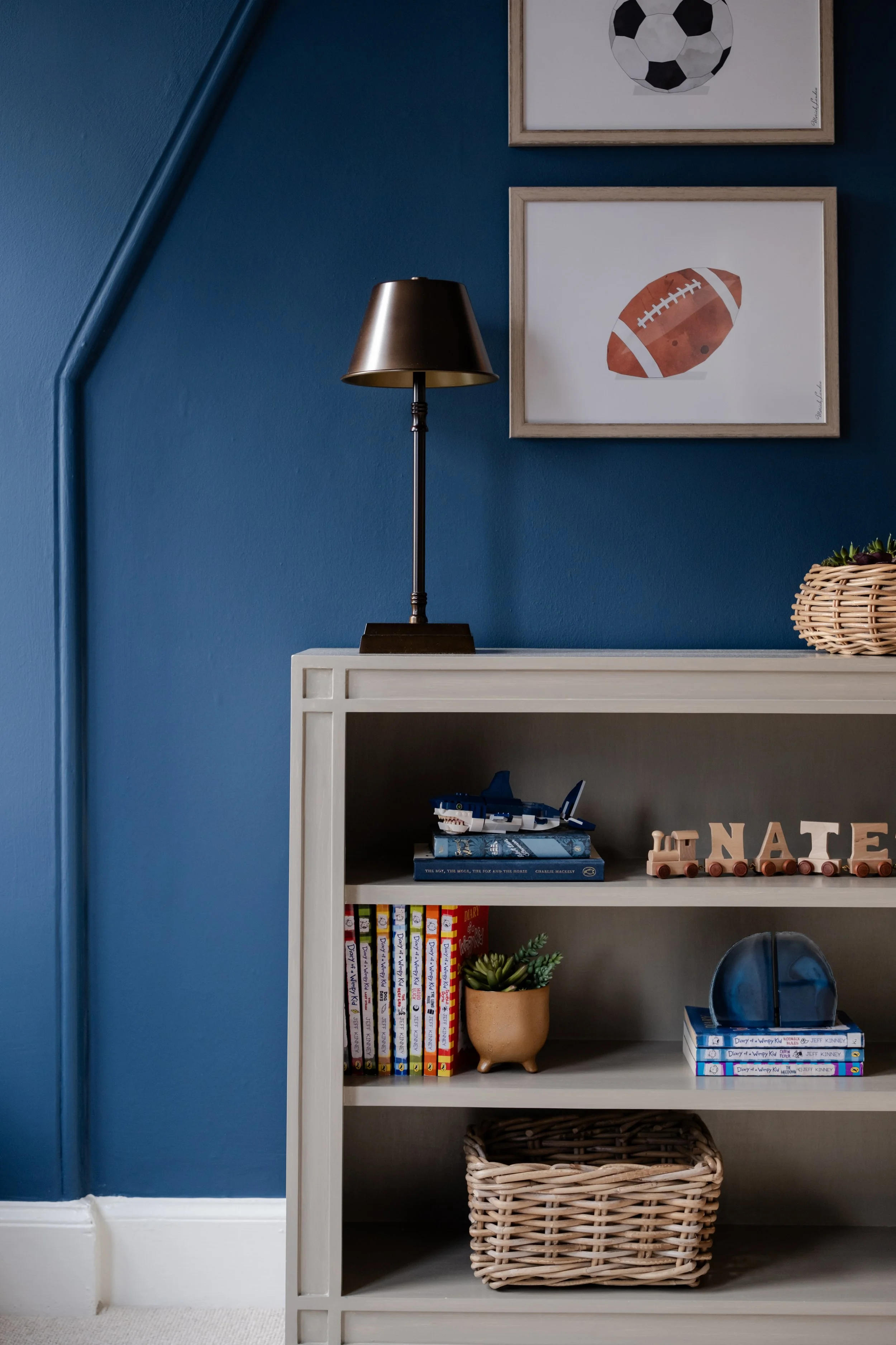 Existing beds were retained, while new furniture choices, such as desks, storage ottomans, and chests of drawers, were selected with longevity in mind. The eldest son’s room features a grown-up palette of dark blue and tan, while soft blues and greys create a restful haven for the youngest.