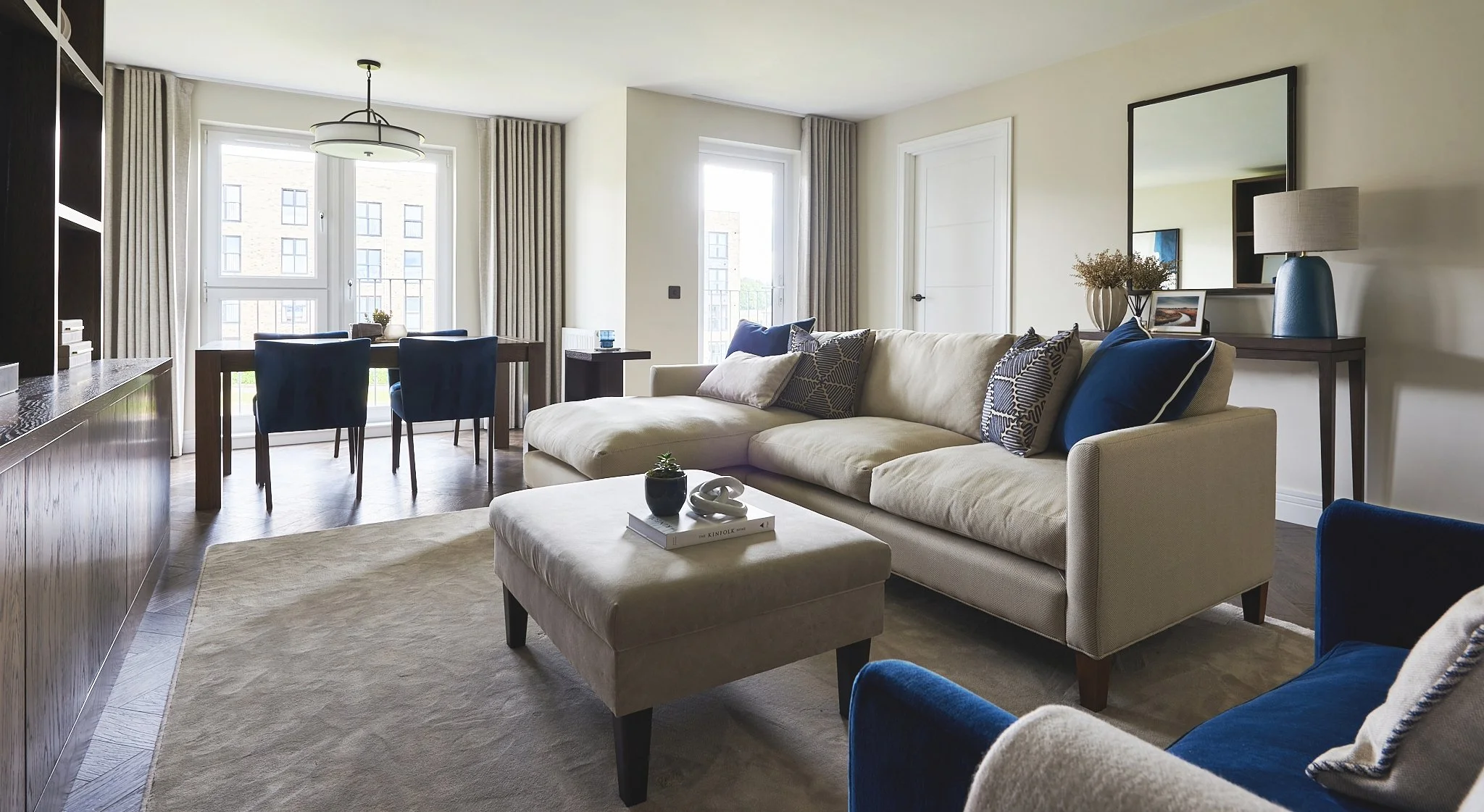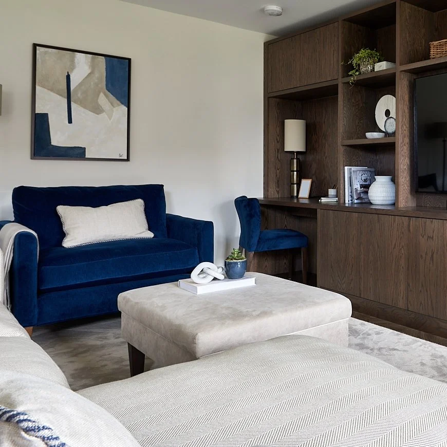 A restrained colour palette of blues with warm neutrals combine with rich chocolate woods to create a cohesive feel across the home. Ironmongery and sockets and switches were upgraded throughout to a classic bronze finish, elevating the look and feel of the home further.